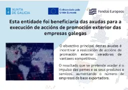 Visionland, gafas, complementos y diseños ópticos, S.L., ha sido beneficiaria de la convocatoria 2025 de ayudas para la ejecución de acciones de promoción exterior de las empresas gallegas (GALICIA EXPORTA EMPRESAS 2025), cofinanciadas por la Unión Europea en el marco del Programa Galicia FEDER 2021-2027 (Resolución de 6 de mayo de 2025 – DOG nº 93, de 16 de mayo de 2025), para el proyecto: Accións de Promoción exterior da empresa Visionland, gafas, complementos y diseños ópticos, SL. El proyecto consiste en la participación en ferias comerciales de carácter internacional.